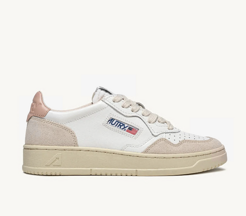 Esta zapatilla para mujer está hecha de cuero blanco suave con un aspecto auténtico y se termina con refuerzos de ante beige para una mezcla táctil y gráfica audaz. El detalle de cuero rosa en el talón está personalizado con el logo de Autry.